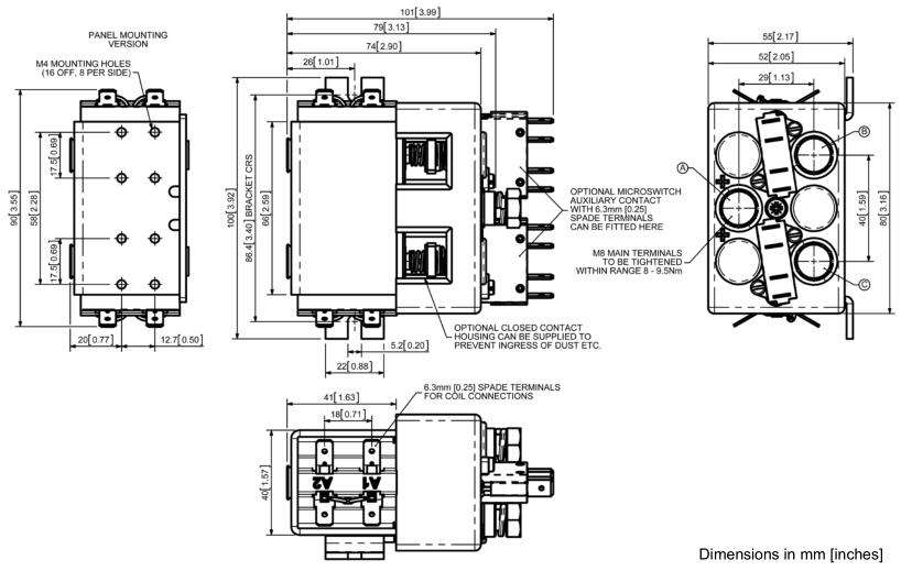 DC92P具有双重断裂的主触点和银合金尖端,这些尖端具有耐焊接性,耐磨损性和导电性能优异。DC92P是整体式结构,结构紧凑,与现代电子控制系统兼容。M8螺柱主端子可以采用多种方式进行配置,以适应应用。随标准提供安装支架,或者提供M4螺纹孔。安装可以是水平或垂直的,垂直时M8接触螺栓应该朝上。如果要求向下定位,我们可以调整接触器来弥补这一点。