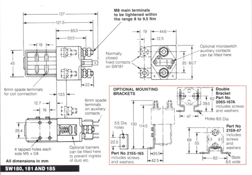 SW185采用单极,单掷,双断主触头,银合金尖端,耐焊接,耐磨,导电性能优良。SW185具有M8螺柱主端子和6.3mm铲形线圈连接。它可以通过M5螺纹孔或安装支架安装 - 可以提供安装,也可以作为单独的项目安装。安装时可以是水平或垂直,垂直时M8接触螺柱应朝上。如果要求是向下定向,我们可以调整接触器以补偿这一点。