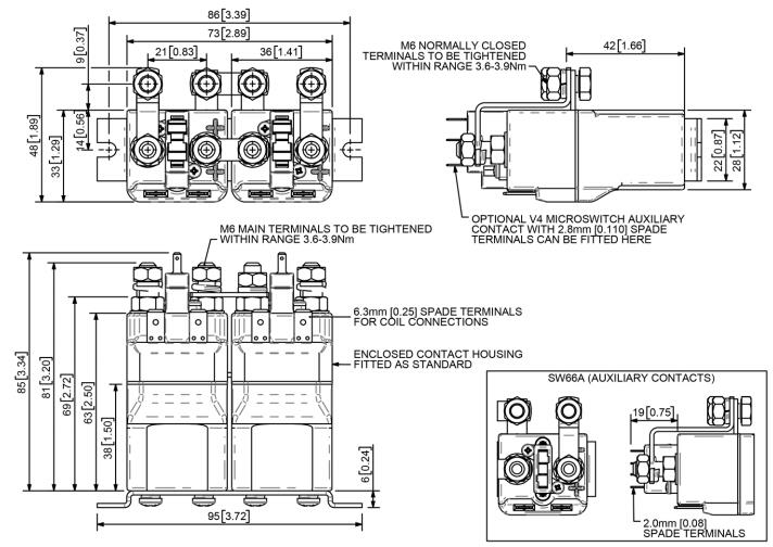 SW66具有单刀双断主触点和银合金尖端,这些尖端具有耐焊接性,耐磨损性和优异的导电性。 SW66具有M6螺柱主端子和6.3mm的黑色线圈连接。 它可以通过M4螺纹孔或安装支架进行安装 - 可以是随机提供的,也可以是单独的物品。安装可以在接触器的侧面或基座上。