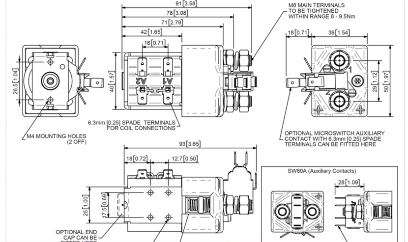 SW80的特点是单极双重断开主触点,银合金尖端,耐焊接,耐磨损,并具有优异的导电性。 SW80具有M8螺栓主端子和6.3mm的黑色线圈连接。 通过M4螺纹孔或安装支架进行安装,或者提供安装,或作为单独的物品。 安装可以是水平或垂直的,垂直时M8接触螺栓应该朝上。 如果要求向下定位,我们可以调整接触器来补偿这一点。