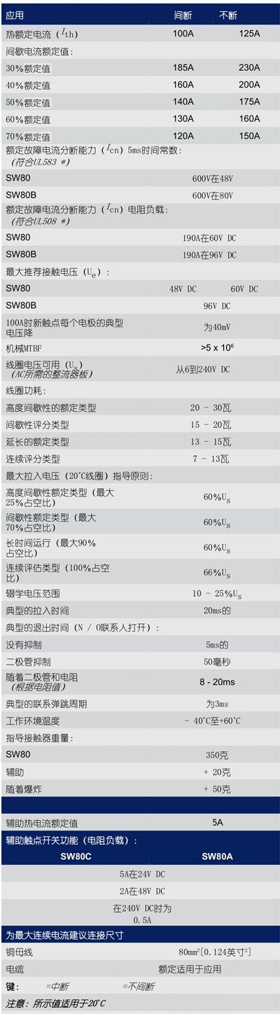 SW80 专为直流负载而设计,包括用于电动车辆(如工业卡车)以及电信和配电应用的电机。 针对中断和不间断负载而开发的 SW80 适用于开关电阻,电容和电感负载 。