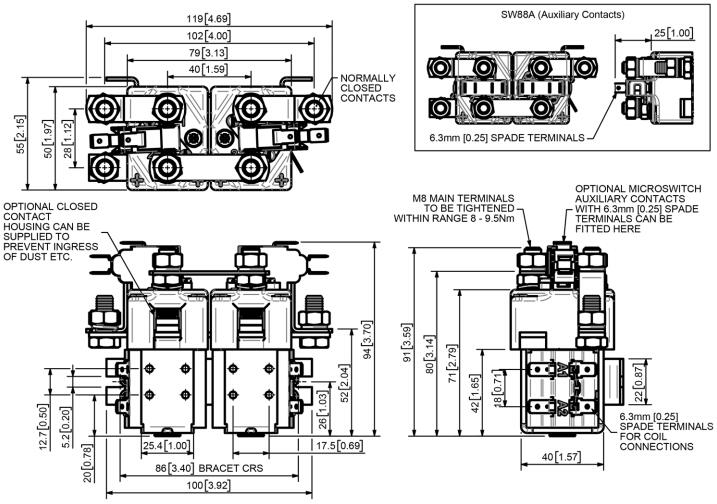 SW88的特点是单极双重断开主触点,银合金尖端,耐焊接,耐磨损,并具有优异的导电性。 SW88具有M8螺栓主端子和6.3mm的黑色线圈连接。 通过M4螺纹孔或安装支架进行安装,或者提供安装,或作为单独的物品。 安装可以是水平或垂直的,垂直时M8接触螺栓应该朝上。 如果要求向下定位,我们可以调整接触器来补偿这一点。